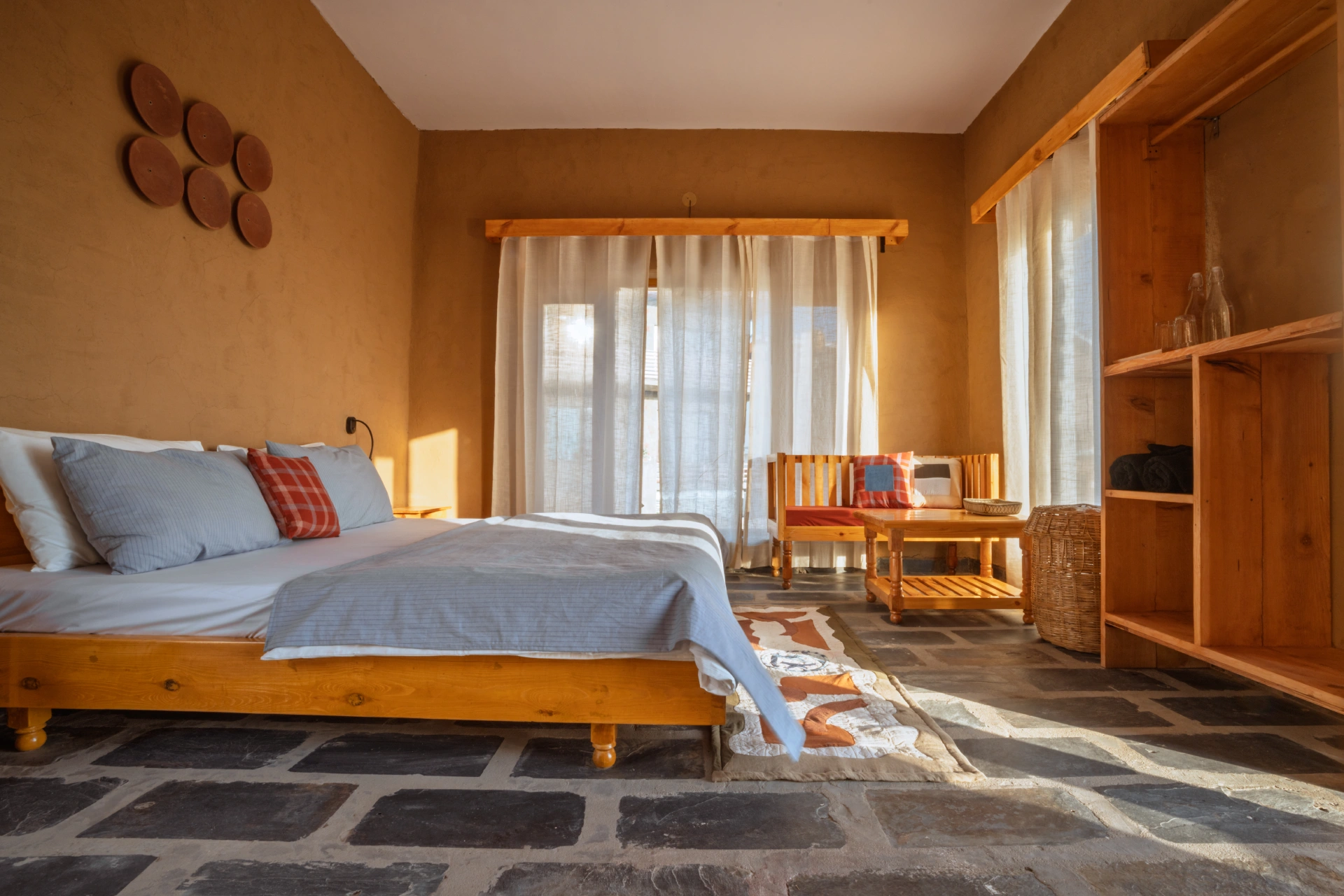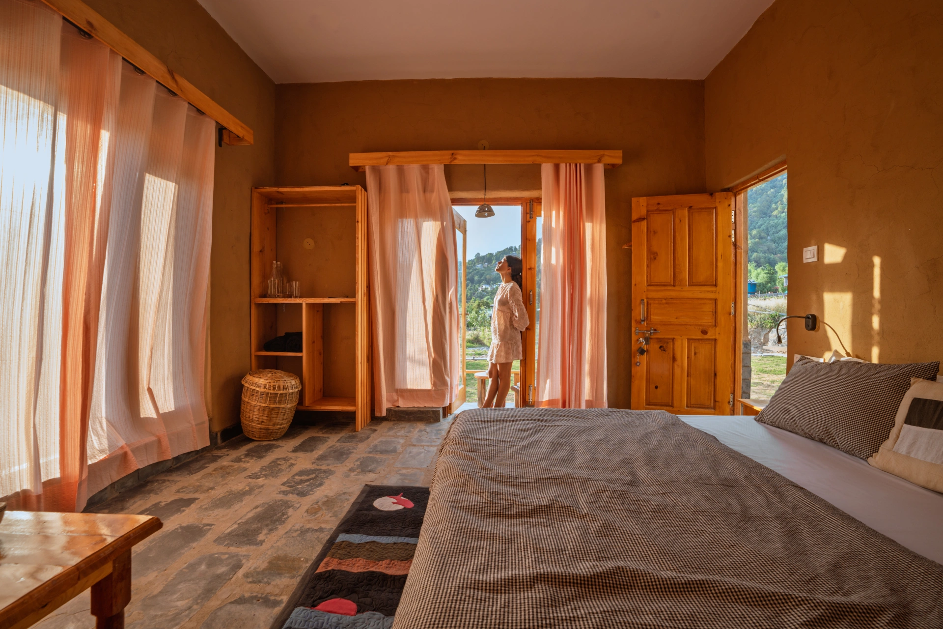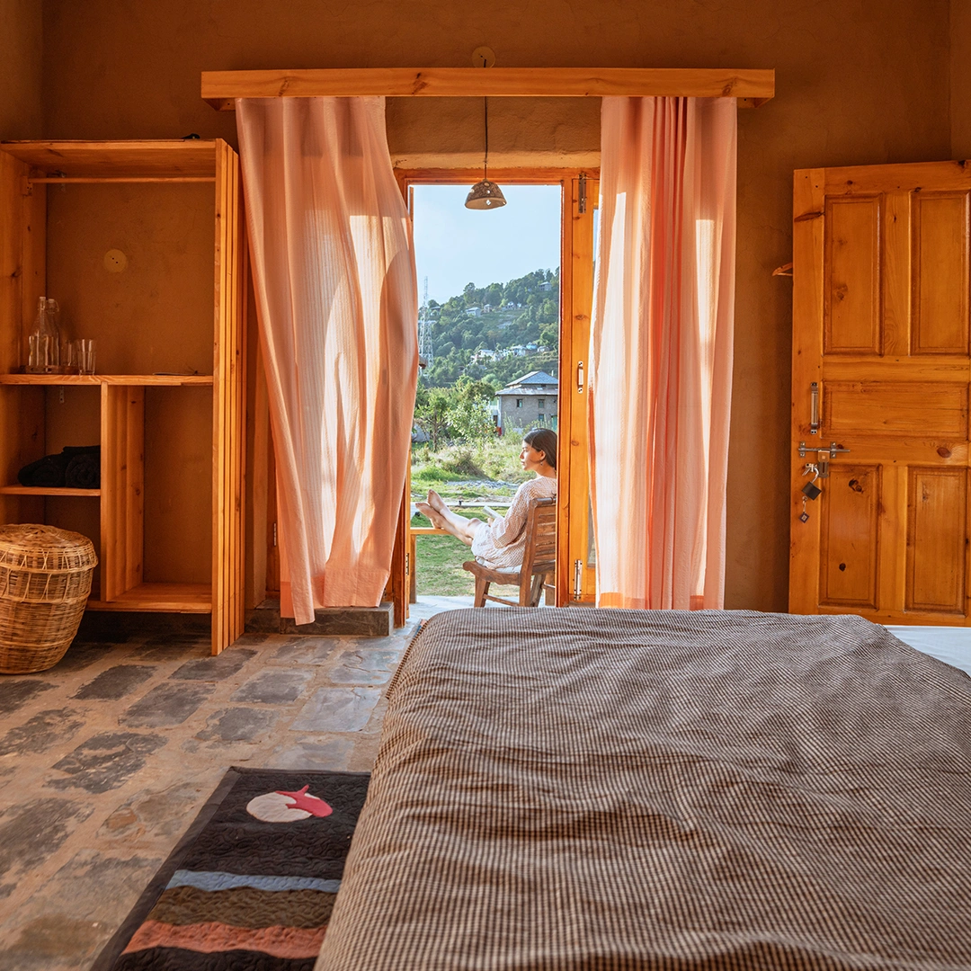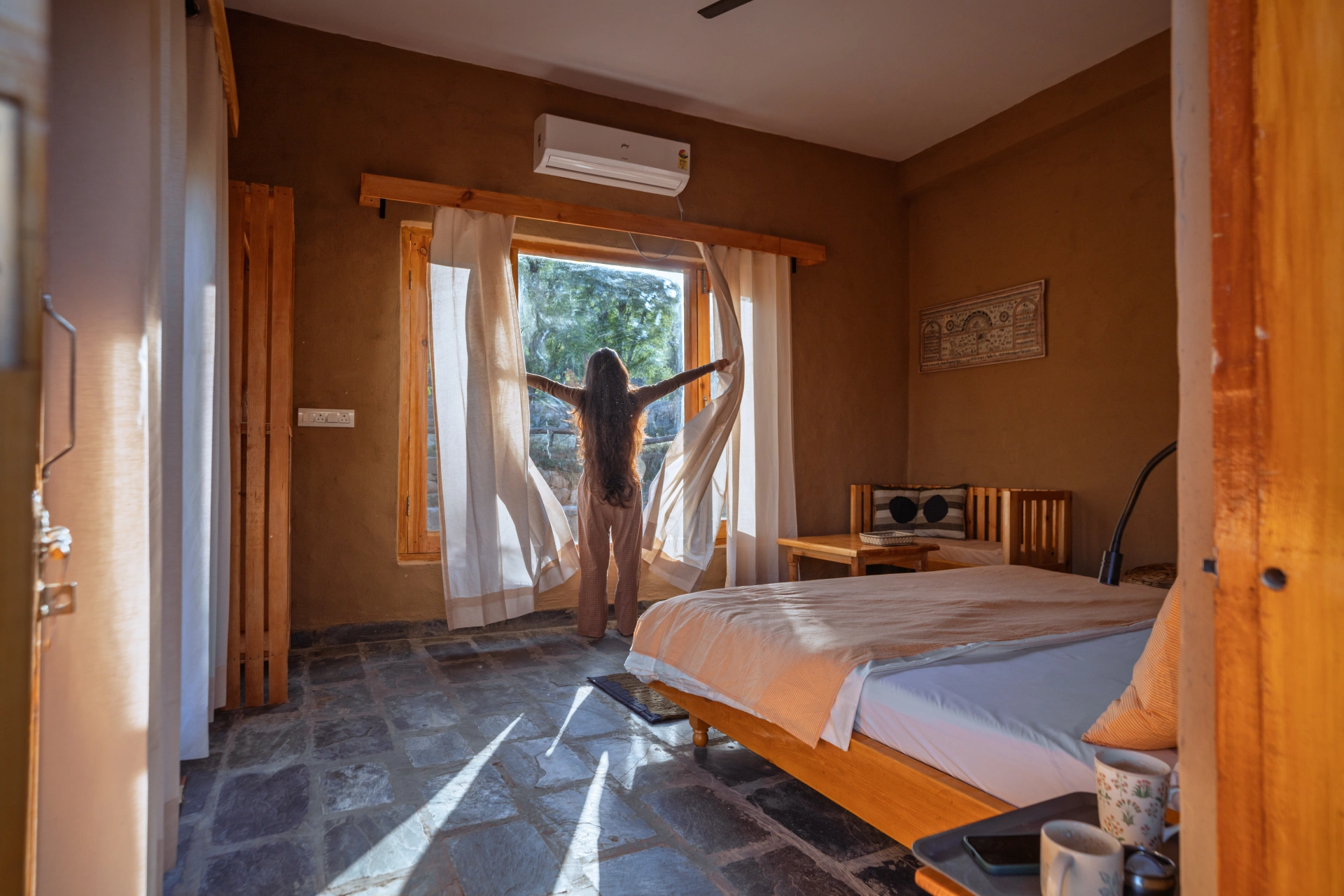 Mud-plastered walls, handcrafted details, and woven finishes create a sensory experience that roots you in the moment.