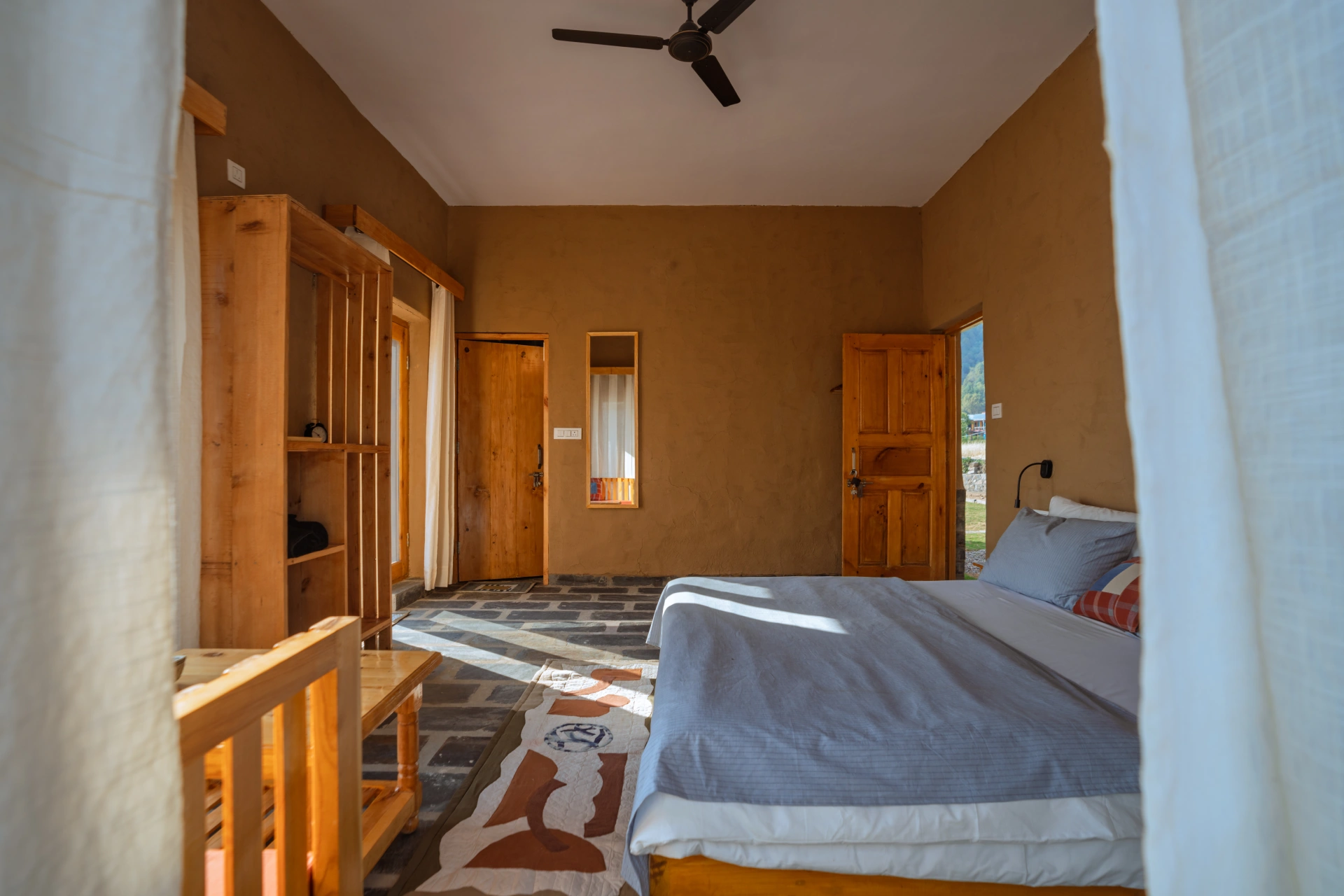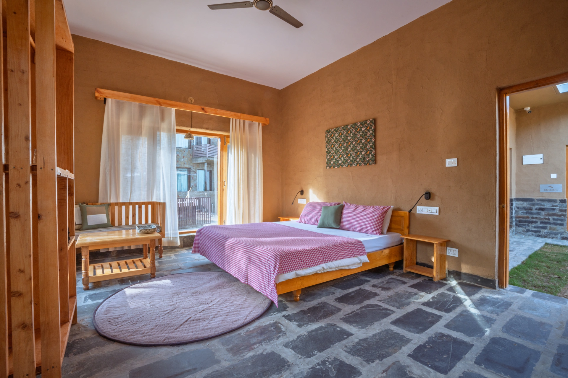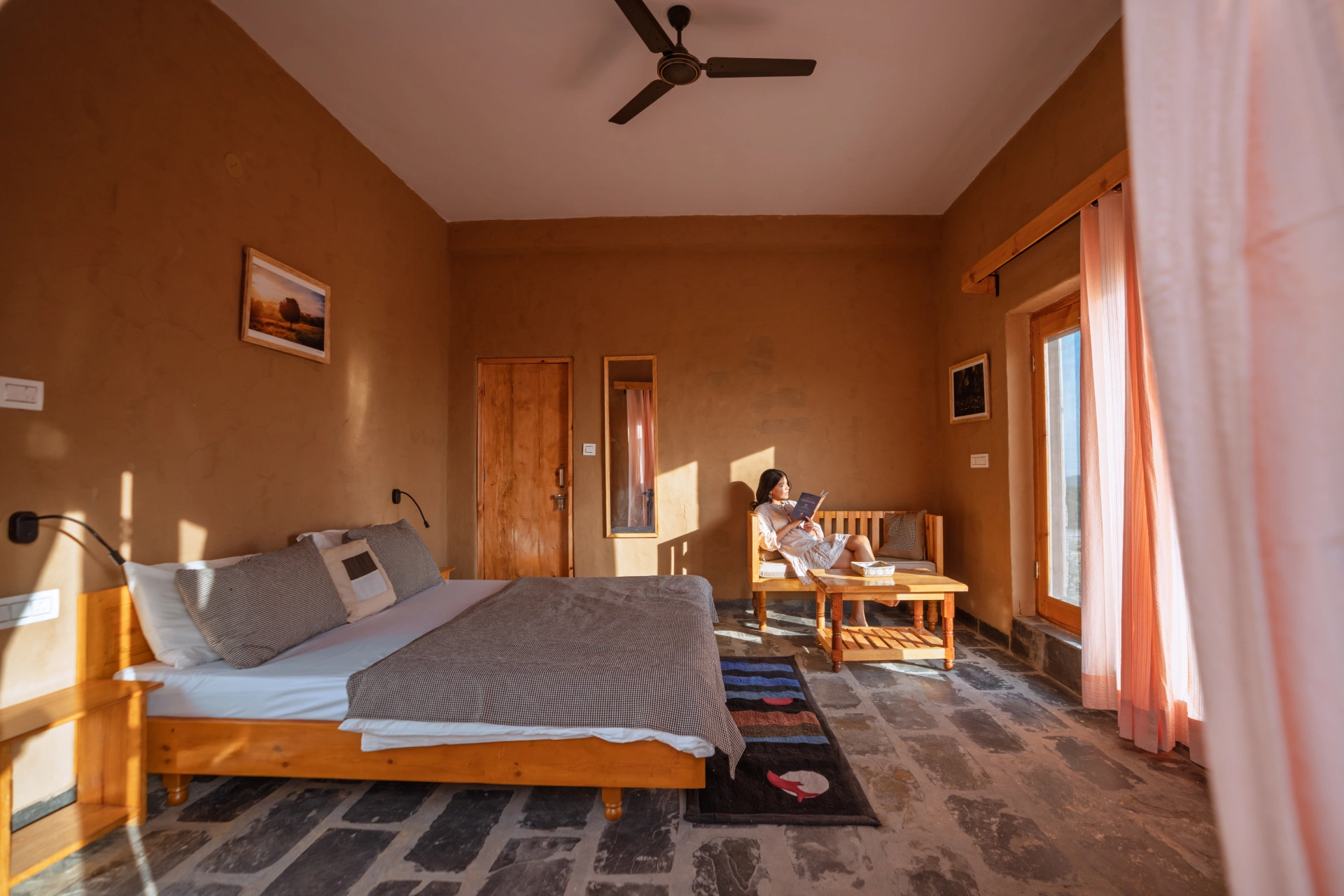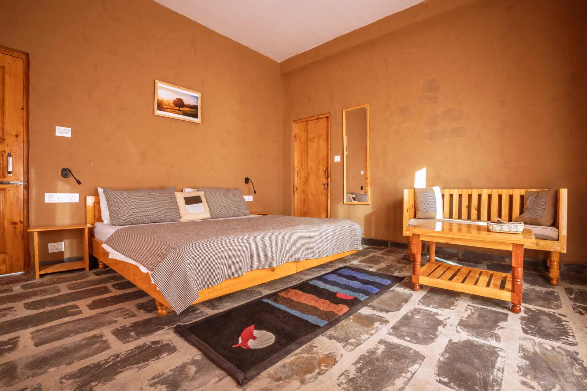 Mud-plastered walls, handcrafted details, and woven finishes create a sensory experience that roots you in the moment.